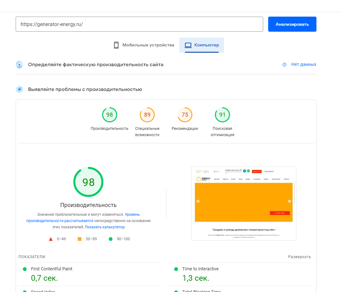 Показатели сервиса google pagespeed